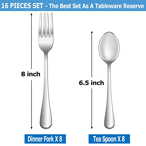 16 Pcs Forks and Spoons Silverware Set,Food Grade Stainless Steel Flatware Cutlery Set for Home,Kitchen and Restaurant,Mirror Polished,Dishwasher Safe – 8 Dinner Fork(8 inch) and 8 Teaspoon(6.5 inch)