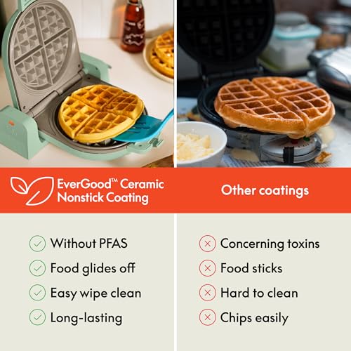 - Easy Cleanup with Smart Coating: Enjoy waffles without the hassle. The EverGood Ceramic Nonstick Coating of this chaffle maker, made without PFAS, PFOA, PTFE, lead, or cadmium, ensures smooth food release and quick wipe-down cleaning every time