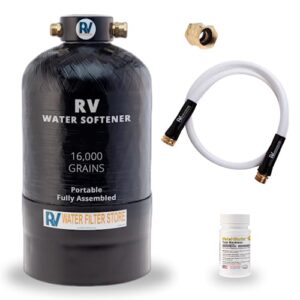 Essential RV Water Softener Portable 16,000 Grain w Custom Hose, Long Lasting for RVers Vanlife, 3/4″ Fittings, Softens Hard Water When Traveling or Mobile Spot Reducing Car Washing