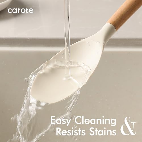 - Durable & Long-lasting: Made with a solid core wrapped in food-grade silicone, these utensils are built to last. Unlike pure silicone tools that may bend when scooping, and metal tools that could damage your non-stick cookware, the Carote utensil set offers the perfect balance of flexibility and durability. Each gadget also features high-quality, thick stainless steel for long-term use.