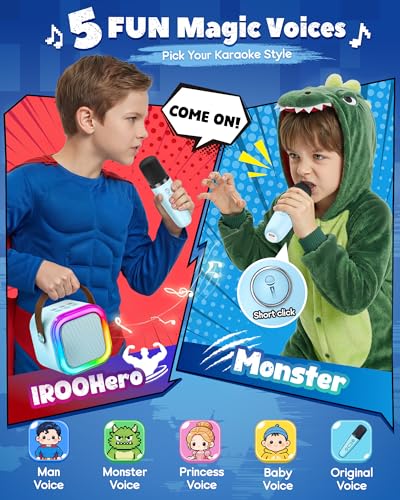 - Crystal Clear Sound & Endless Fun: As the pioneer in kids’ karaoke machines, IROO features advanced audio drivers and smart noise reduction—virtually no howling! Volume is scientifically controlled to protect little ears. With 5 fun voice effects, singing becomes an exciting adventure—perfect for budding superheroes, dinosaur explorers, or young rockstars. Turn your living room into a superhero training ground or your backyard into a racecar stage—let the show begin!