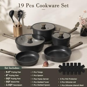 Astercook Non Stick Pots and Pans Set, Healthy Non-Toxic Titanium Induction Kitchen Cookware Sets for Cooking with Frying Pans, PFAS/PTFE/PFOA & PFOS Free, Black, 19 Pcs