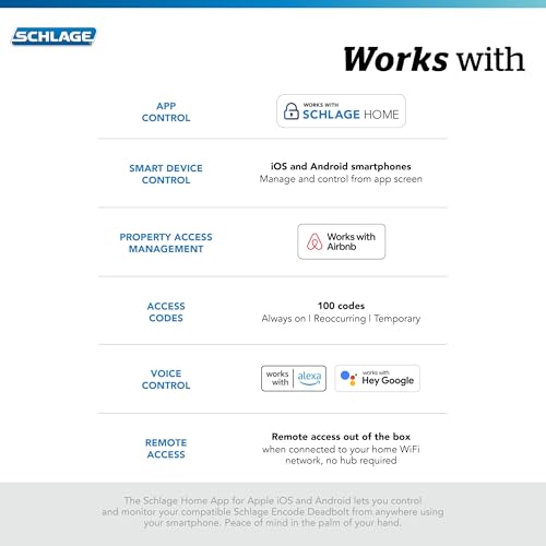 - PEACE OF MIND: Lock and unlock from anywhere, manage up to 100 access codes for keyless entry, view lock history, receive customizable notifications and easily manage multiple locks at once – all when paired to the Schlage Home app and connected to a secure WiFi network
