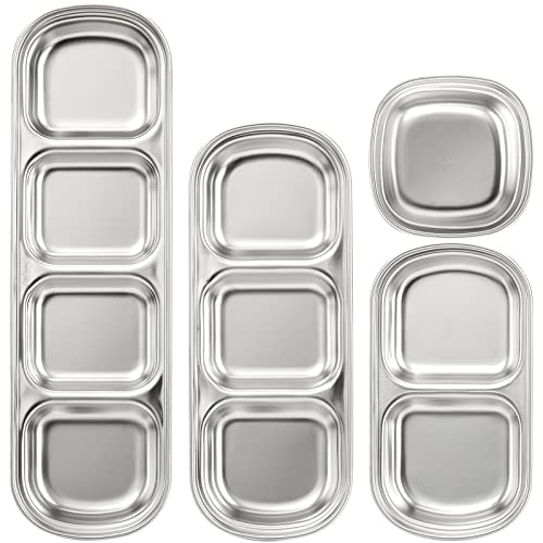 SOUJOY 4 Pcs Stainless Steel Sauce Dish, Divided Seasoning Sauces Dip Bowl, 1/2/3/4 Compartment Korean Ketchup Sauce Bowl, Vinegar Soy Spice Condiment Tray for Home Restaurant